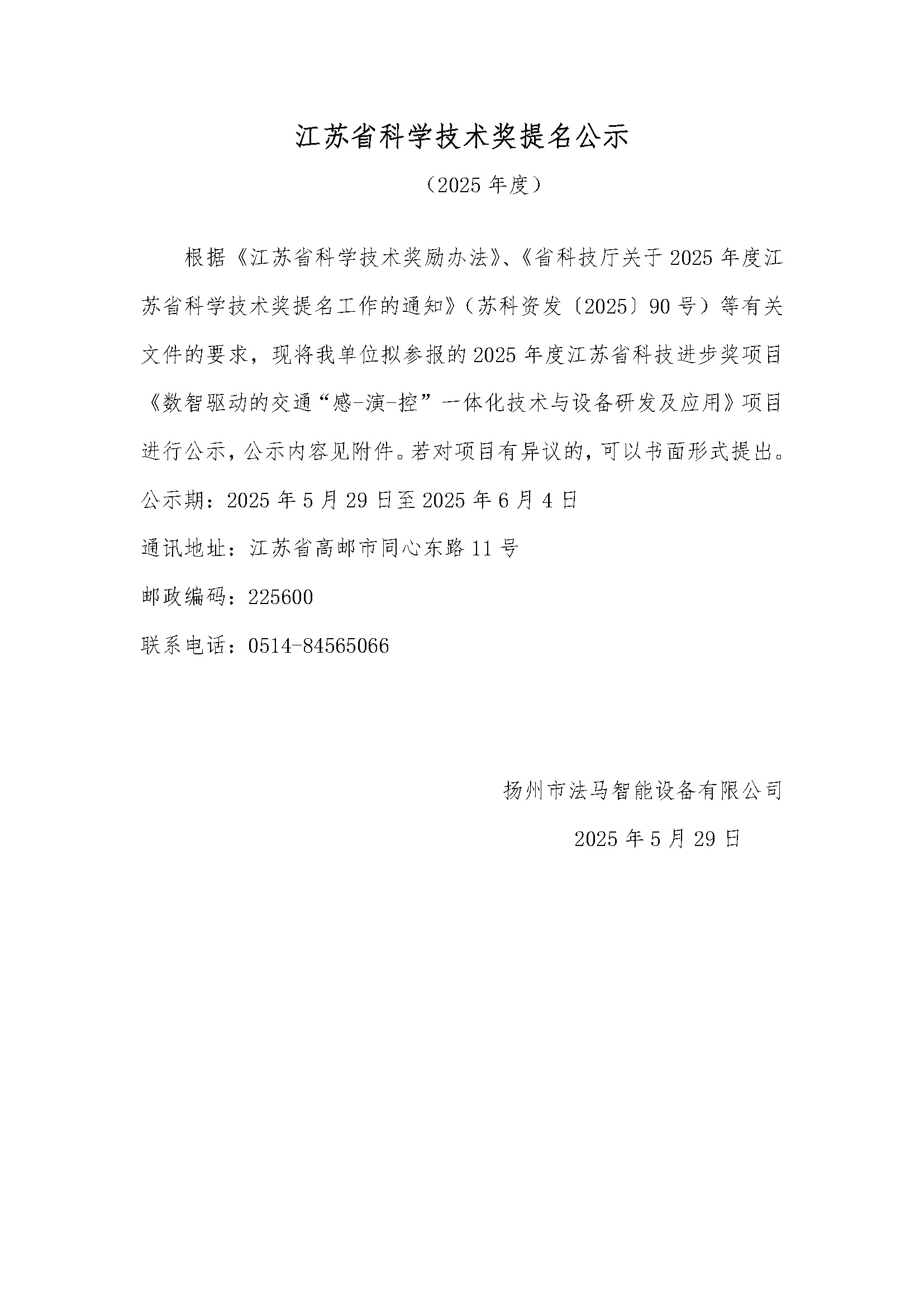 根據(jù)《江蘇省科學(xué)技術(shù)獎勵辦法》、《省科技廳關(guān)于2025年度江蘇省科學(xué)技術(shù)獎提名工作的通知》(蘇科資發(fā)〔2025〕90號)等有關(guān)文件的要求,現(xiàn)將我單位擬參報的2025年度江蘇省科技進步獎項目《數(shù)智驅(qū)動的交通“感-演-控”一體化技術(shù)與設(shè)備研發(fā)及應(yīng)用》項目進行公示,公示內(nèi)容見附件。若對項目有異議的,可以書面形式提出。