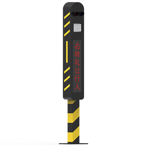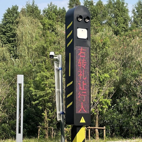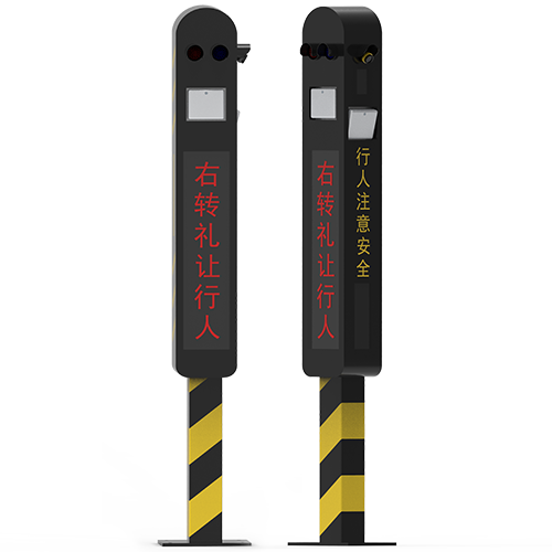 模組信息屏,用于對右轉(zhuǎn)車道的司機進行文字預(yù)警及宣導(dǎo),右轉(zhuǎn)盲區(qū)風(fēng)險低,則顯示右轉(zhuǎn)禮讓行人;右轉(zhuǎn)盲區(qū)存在沖突目標(biāo),則警示注意右行人;