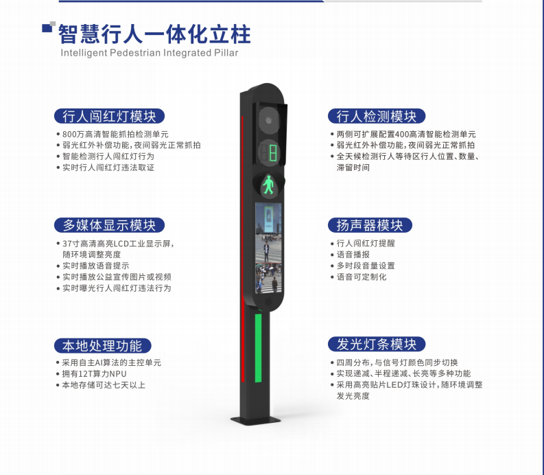 智慧行人過街管控提升方案,通過在斑馬線設(shè)置行人闖紅燈抓拍功能、語音播報(bào)提醒、LCD屏曝光等手段,對行人闖紅燈進(jìn)行治理工作,解決行人闖紅燈問題,以及沒有對盲人過街進(jìn)行有效指示問題,減少斑馬線事故