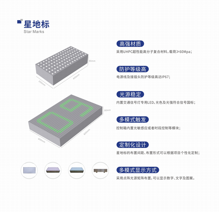不僅在信號燈、語音以及圖像對行人進(jìn)行提醒和警示,同時方案中的星地標(biāo)采用點(diǎn)陣燈珠排布,可同步顯示行人倒計(jì)時或顯示文明標(biāo)語,在亮化了斑馬線為駕駛員提供好的視線的同時,又有效地為低頭族等行為人員給予提醒與警示